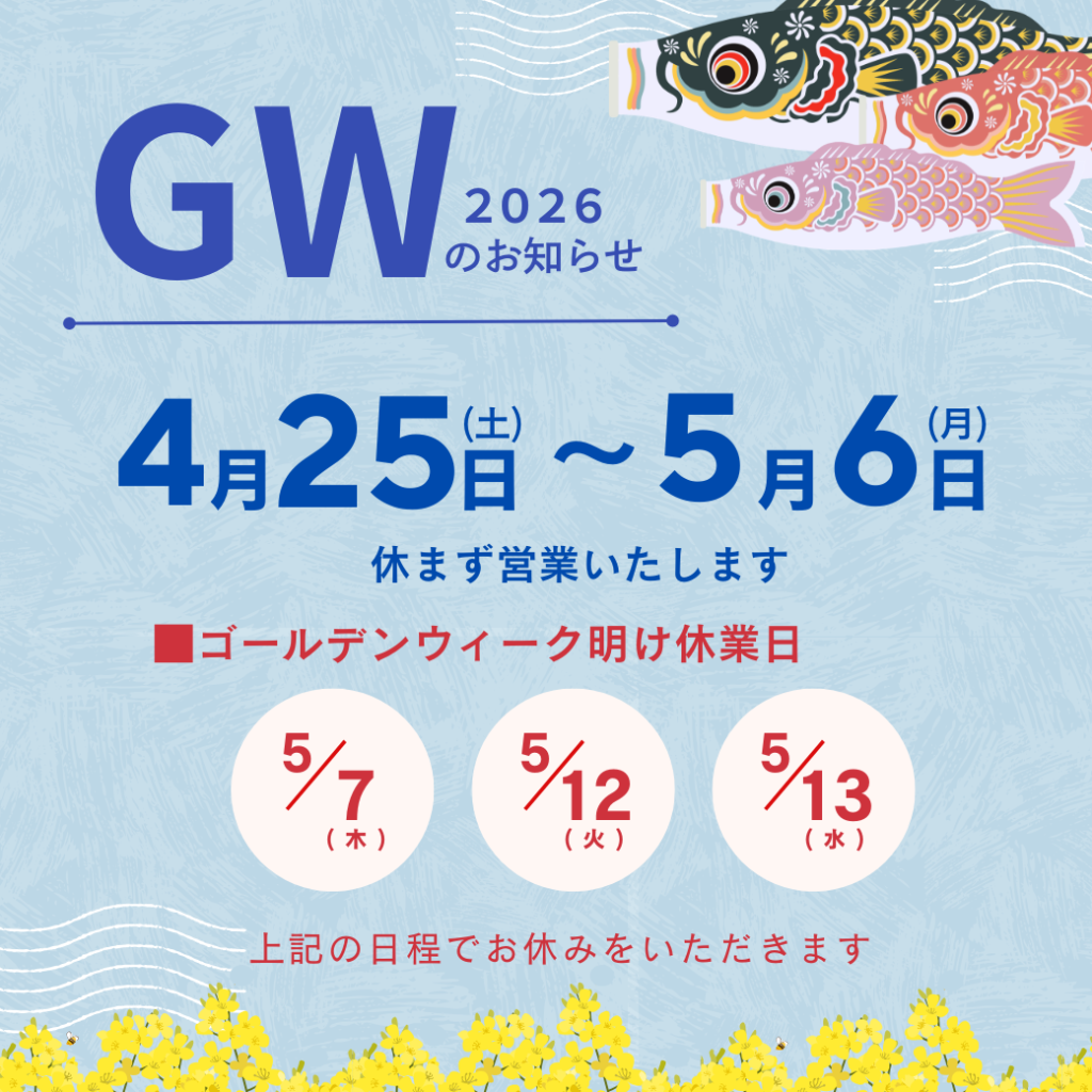 ◆ゴールデンウイークのご案内◆ 4月 16, 2026 ■GW期間4月25日~5月6日は休まず営業いたします。 5月7日(木)、12日(火),13日(水)はお休みとさせていただきます。 ※GW期間中は平日メニューはお休みとさせていただき、GW特別メニューとなります。