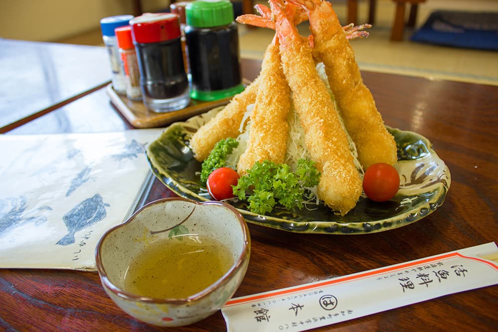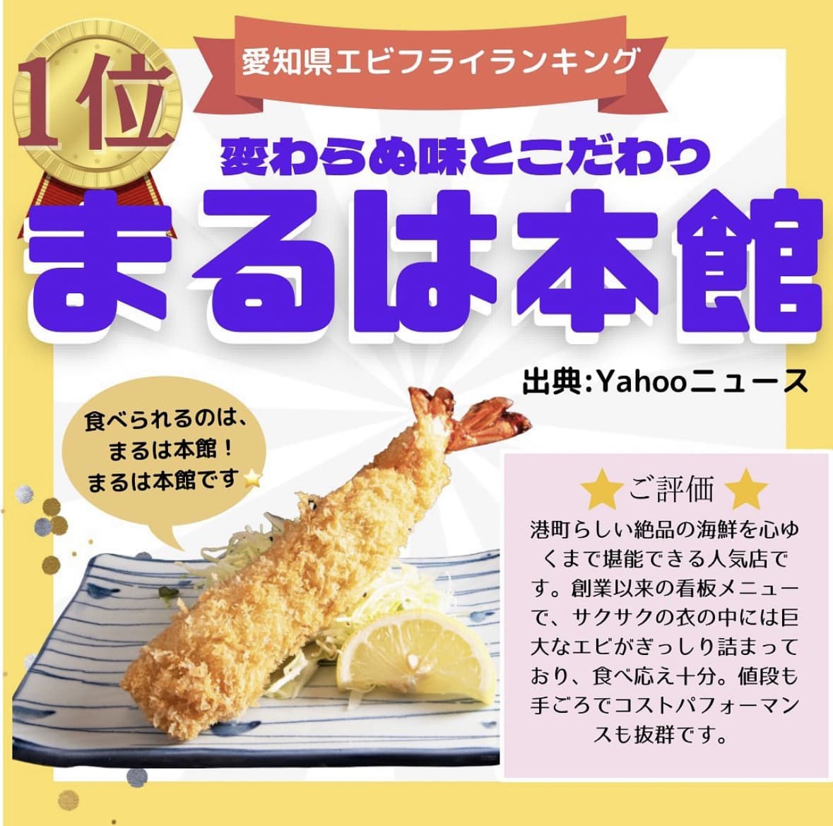まるは本館のエビフライは、他の店とは違う味付けが魅力です。