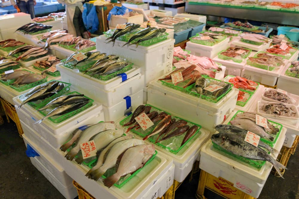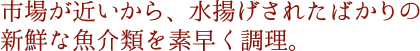 漁から帰ったばかりの漁船から新鮮な魚介類が次々と水揚げされ、“夕市”が始ります。